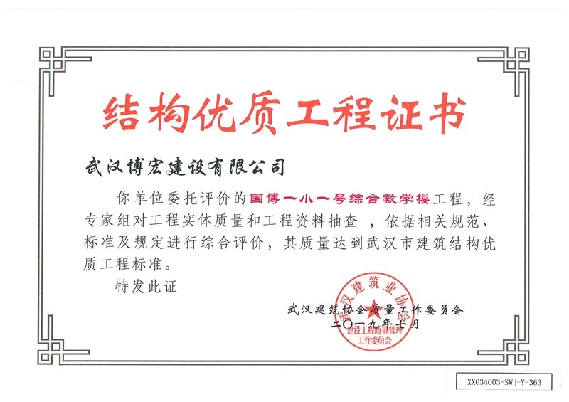 結(jié)構(gòu)優(yōu)質(zhì)工程證書(國博一小一號綜合教學(xué)樓)