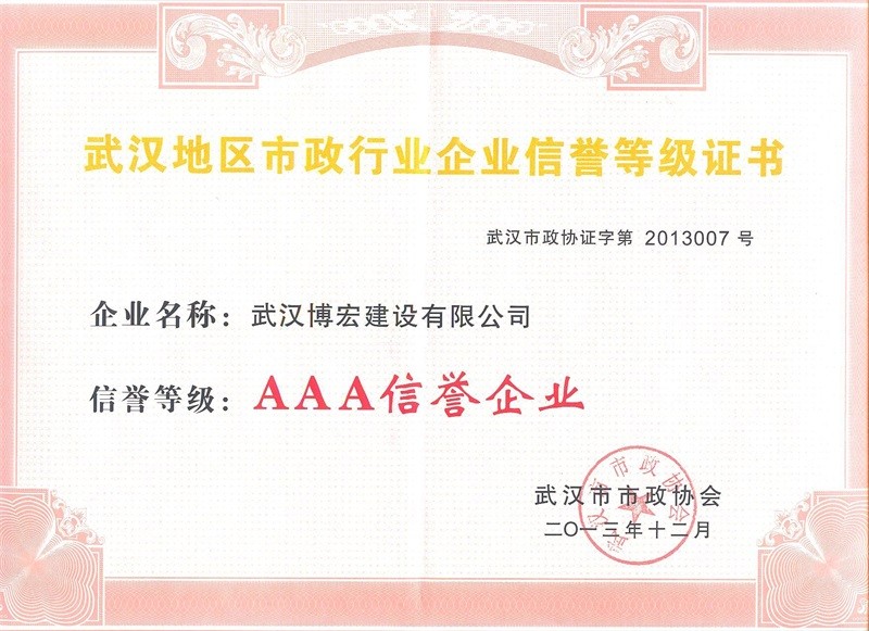 2013年度武漢地區(qū)市政行業(yè)企業(yè)信譽(yù)等級證書