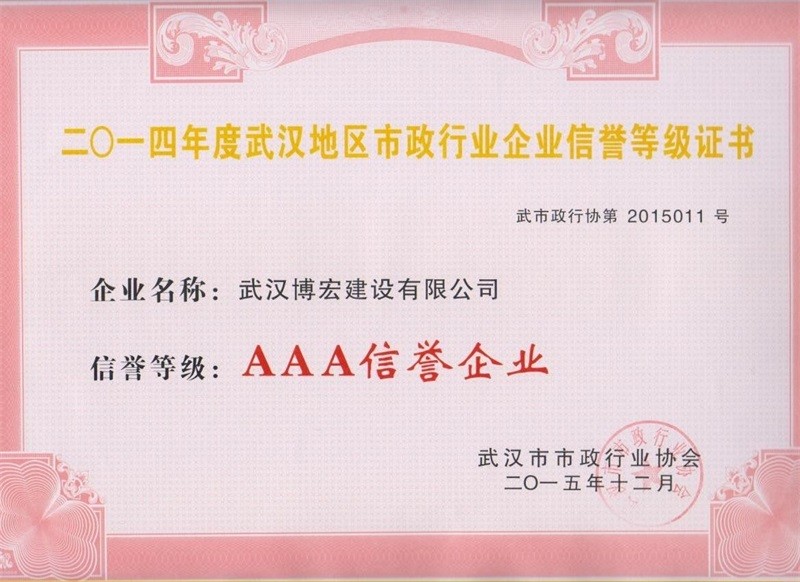 2014年度武漢地區(qū)市政行政企業(yè)信譽(yù)等級證書