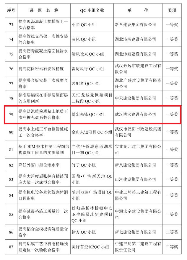 每年,公司都根據(jù)各大在建項目的實際情況,針對生產(chǎn)中的難題,從挖潛增效、強化管理等角度確定課題,成立相關技術攻關小組,構思切實可行的質量提升措施,并邀請技術專家對其進行指導完善。本次獲得一等獎的《提高淤泥質粉質粘土地質下灌注樁充盈系數(shù)合格率》,在其攻關過程中,“博宏先鋒 QC 小組”制定了嚴格的工作計劃和科學的攻關流程,按月推進,最終形成了一套可復制、可推廣的工作經(jīng)驗,攻關小組也通過QC活動掌握了一套提升項目管理質量的方法論。