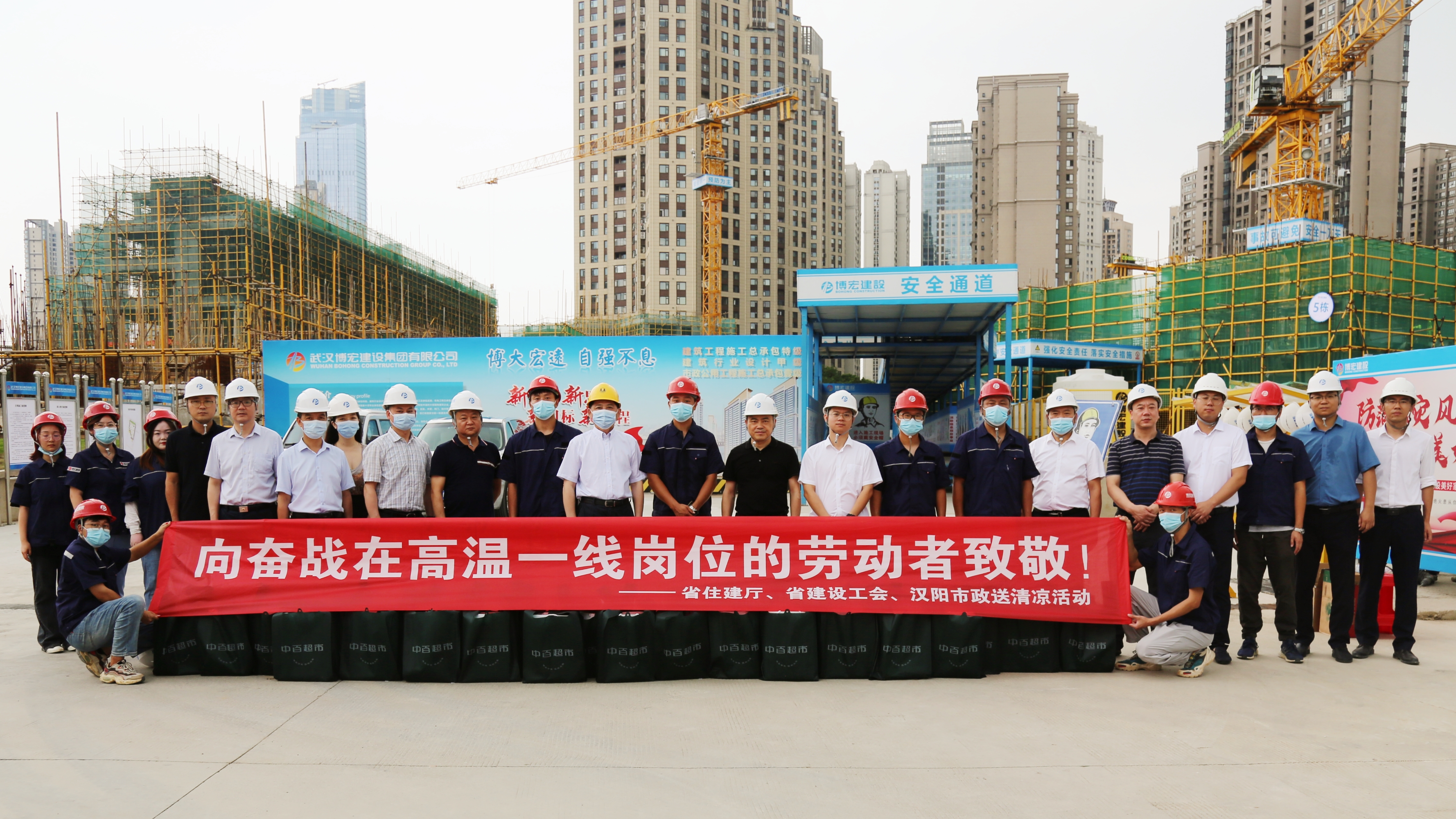 烈日炎炎,酷暑當頭。近日,武漢地區(qū)高溫預(yù)警不斷拉響。為確保武漢城市建設(shè)有序進行,全體博宏人堅守崗位、揮灑汗水、不辭辛勞,奮戰(zhàn)在項目一線。7月28日上午10點整,湖北省住建廳黨組成員、副廳長金濤,住房保障處處長阮斌,房地產(chǎn)市場建管處處長康忠榮,建設(shè)工會主任賴濤等領(lǐng)導(dǎo)一行走訪慰問博宏建設(shè)集團新建居住、商業(yè)項目(月湖船院),漢陽市政黨委書記、董事長嚴悌文,副董事長虞志鵬,武漢城建集團黨委委員、副總經(jīng)理邢榮斌等陪同調(diào)研,共計10余人參加了活動。