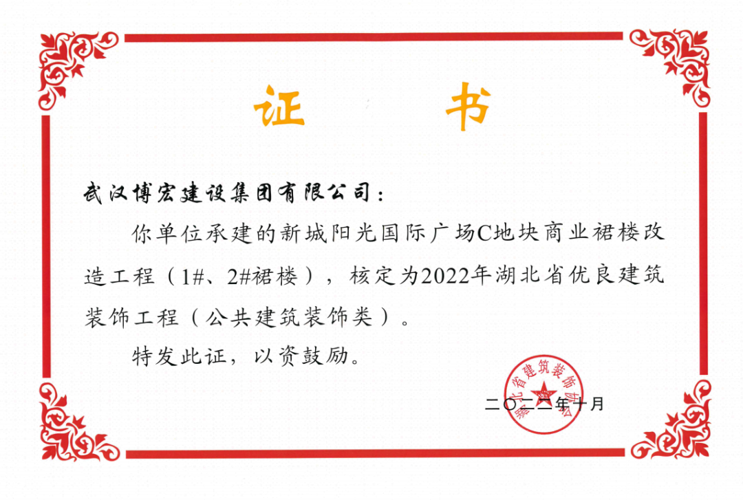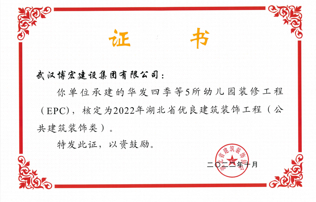 近日,湖北省建筑裝飾協(xié)會發(fā)布了《關(guān)于開展2022年湖北省建筑裝飾工程質(zhì)量目標考核工作的通知》,由博宏建設(shè)集團承建的華發(fā)四季等5所幼兒園裝修工程(EPC)、新城陽光國際廣場C地塊商業(yè)裙樓改造工程(1#、2#裙樓)、新城陽光國際廣場D地塊商業(yè)裙樓改造工程(D座裙樓)、武漢市漢陽區(qū)八所中小學新建PPP項目-永安堂小學被核定為“2022年湖北省優(yōu)良建筑裝飾工程(公共建筑裝飾類)”。