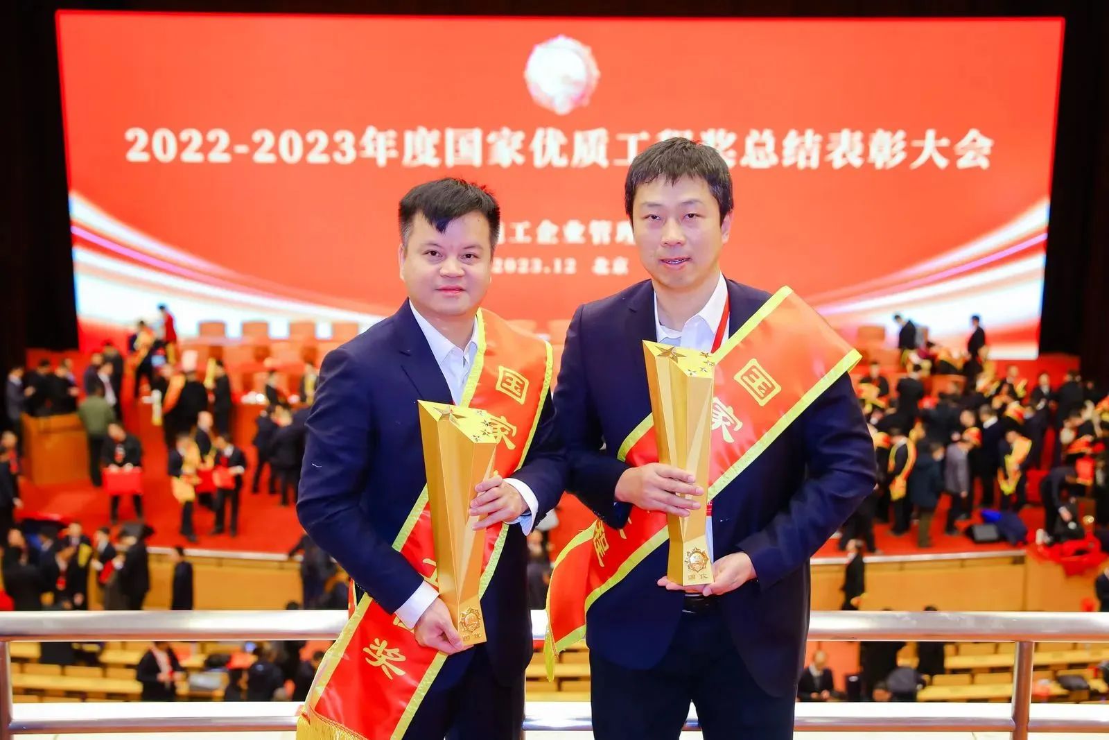 12月24日,2022~2023年度國家優(yōu)質(zhì)工程表彰大會在北京隆重召開,公司總經(jīng)理助理李暉、項目經(jīng)理童威接受頒獎。博宏建設(shè)集團(tuán)捧回了兩座浸染著汗水與拼搏的榮譽獎杯。