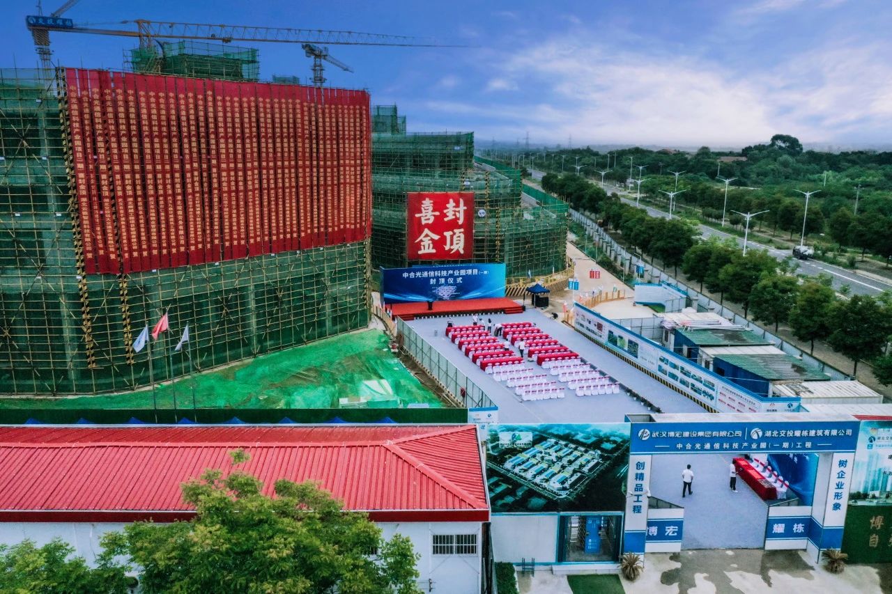 上午 11 時(shí) 18 分,孝感市人大常委會副主任、臨空區(qū)工委書記邱顯春宣布項(xiàng)目喜封金頂,現(xiàn)場禮炮齊鳴,中合光通信科技產(chǎn)業(yè)園項(xiàng)目(一期)封頂儀式圓滿禮成!
